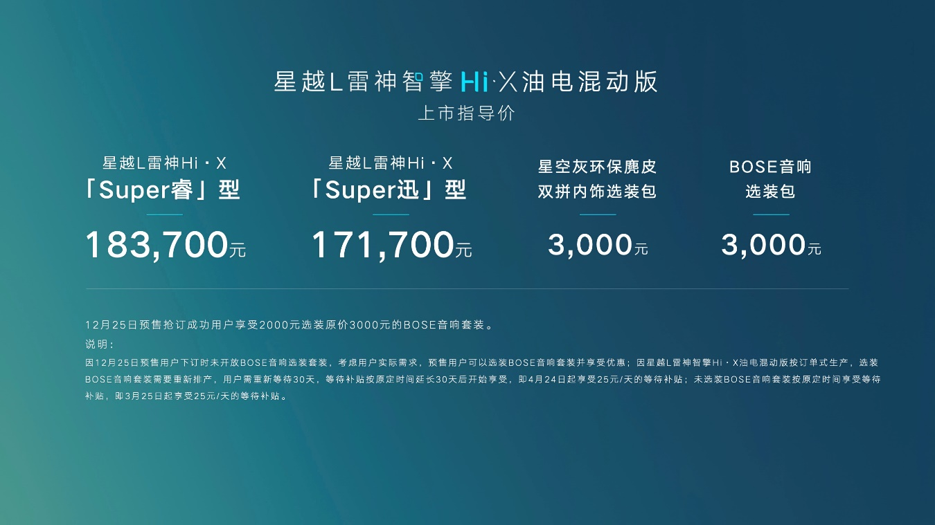 3月30日,星越L雷神Hi·X油电混动版正式全球上市。新车推出2款车型,官方指导价分别为18.37万元和17.17万元。...[详细]
